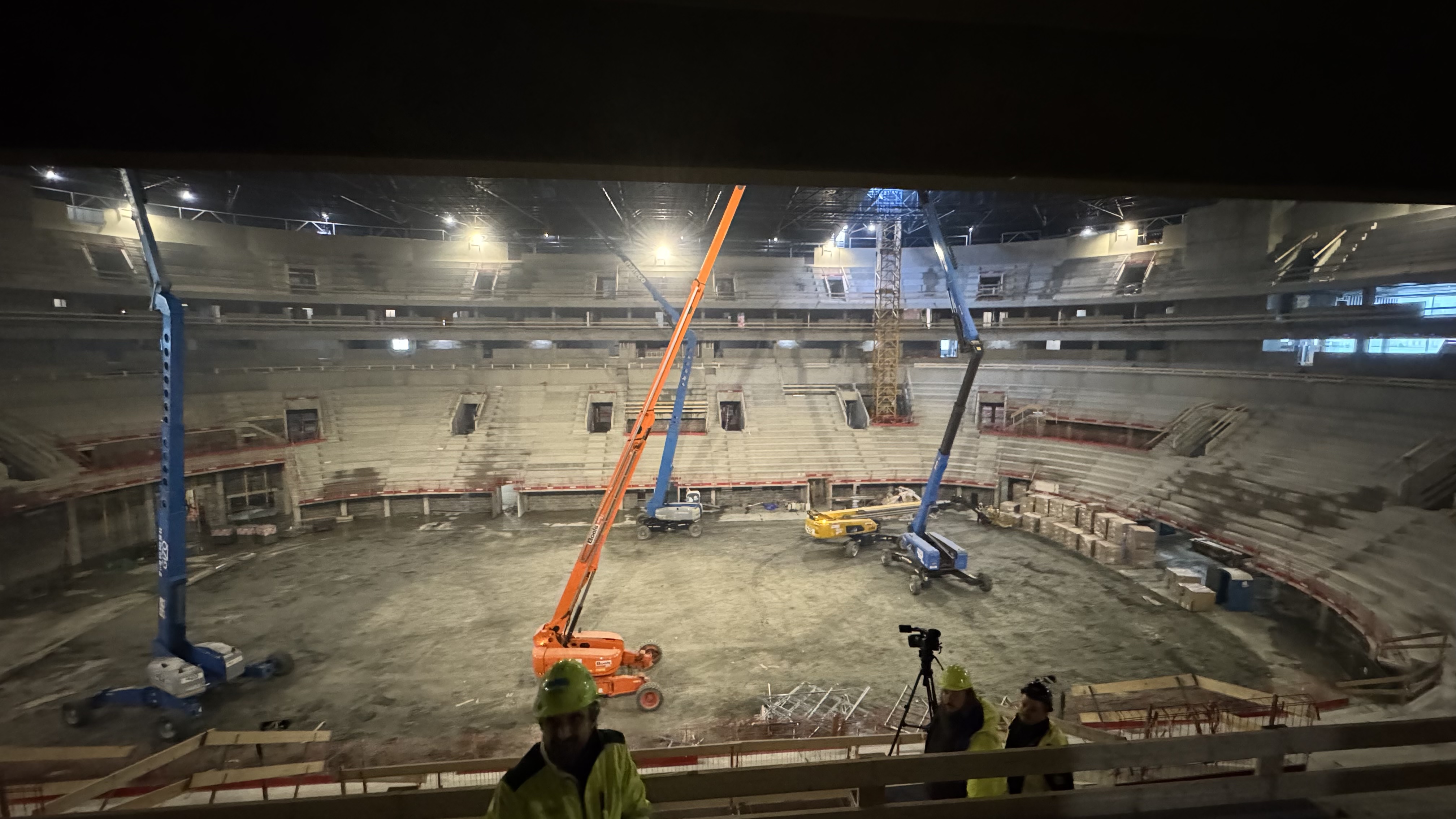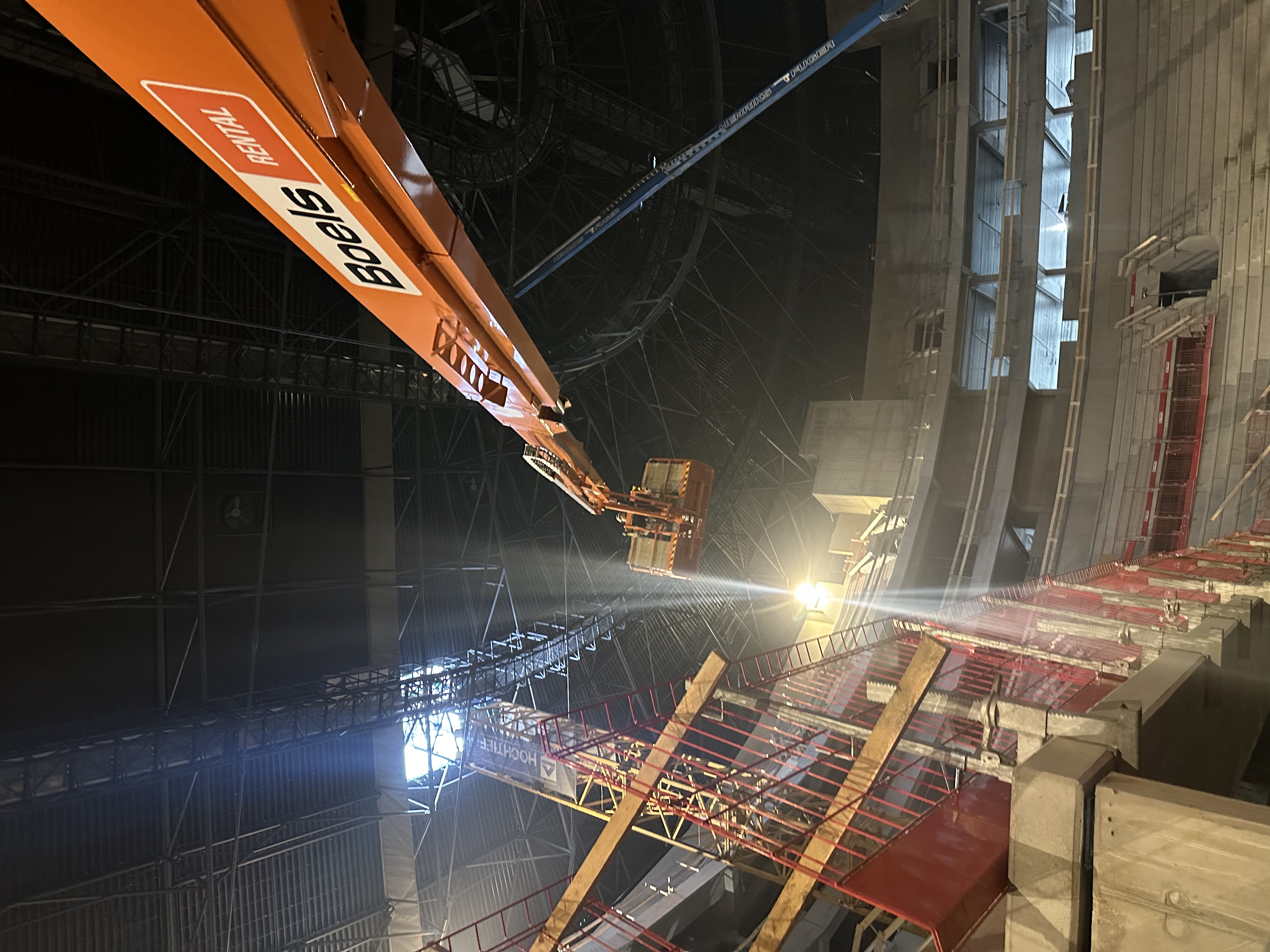 Dokončena montáž servisních lávek pod střechou. Probíhá montáž výtahů, kterých bude v hale ve finále 18. Dále probíhá lití cementových podlah. Dále probíhá dokončování montáže markýz a montáž akustických clon pod střechou.