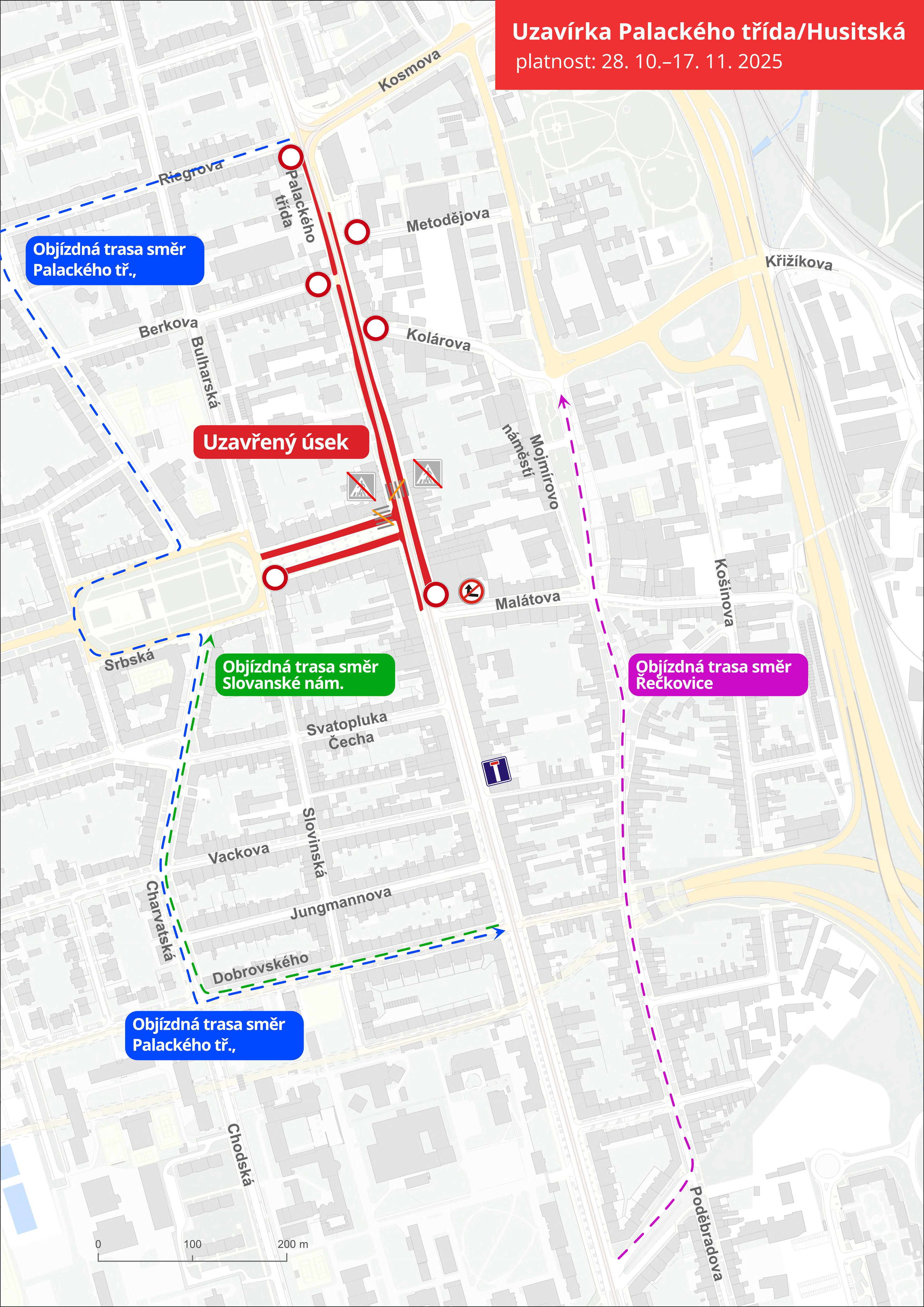 - úplná uzavírka komunikace Husitské (v úseku Slovinská – Palackého třída),