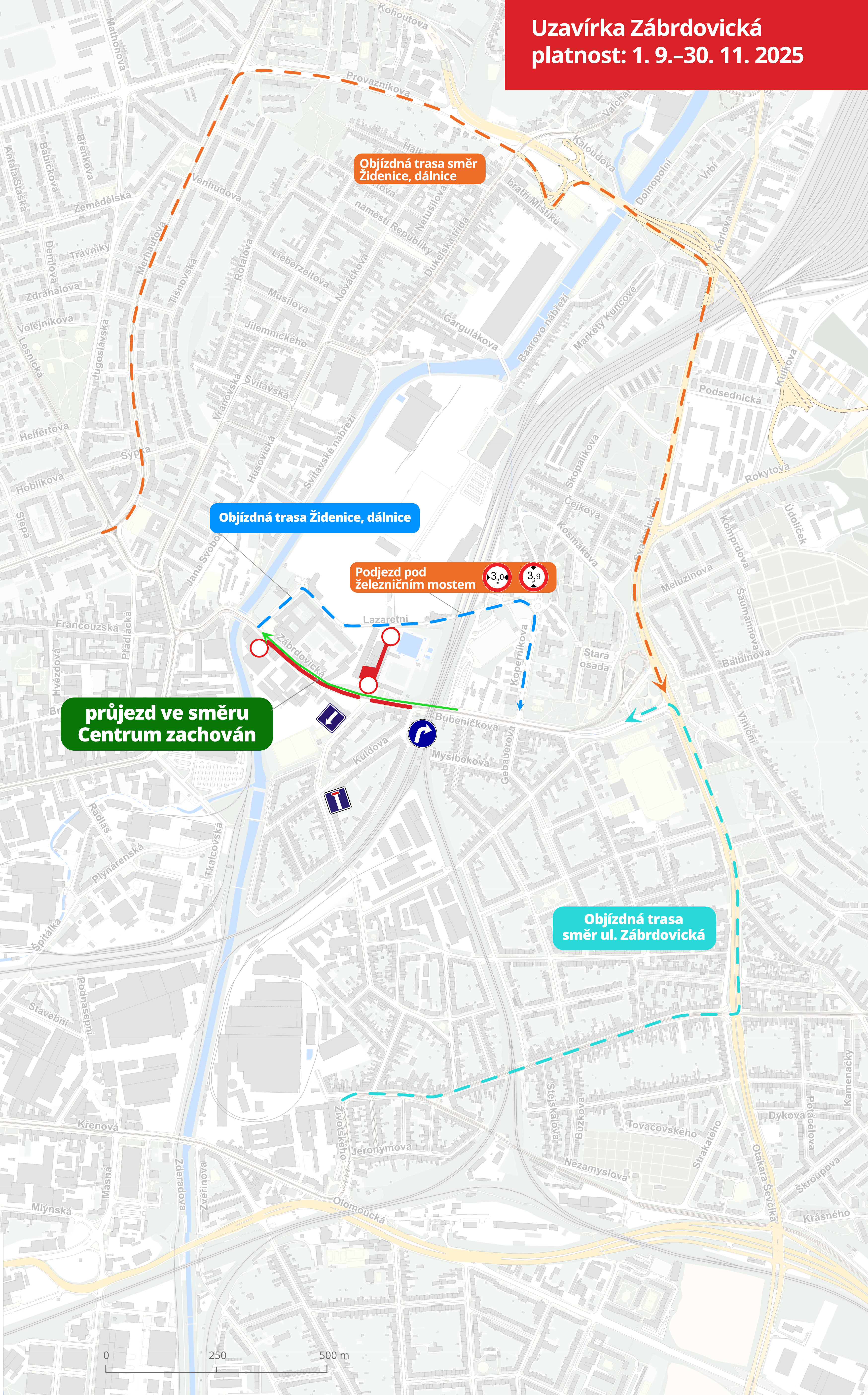 - uzavírka jednoho jízdního směru (z centra) komunikace Zábrdovické v úseku Lazaretní – Kuldova,