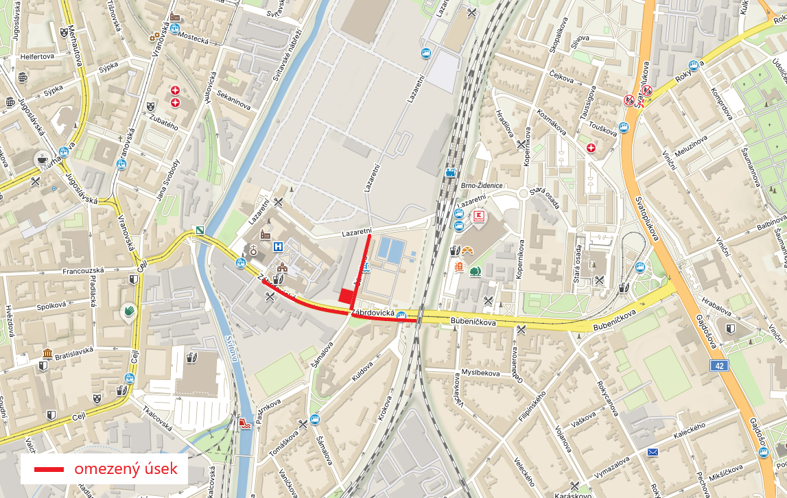 - úplná uzavírka komunikace Šámalovy v úseku Lazaretní – Zábrdovická,