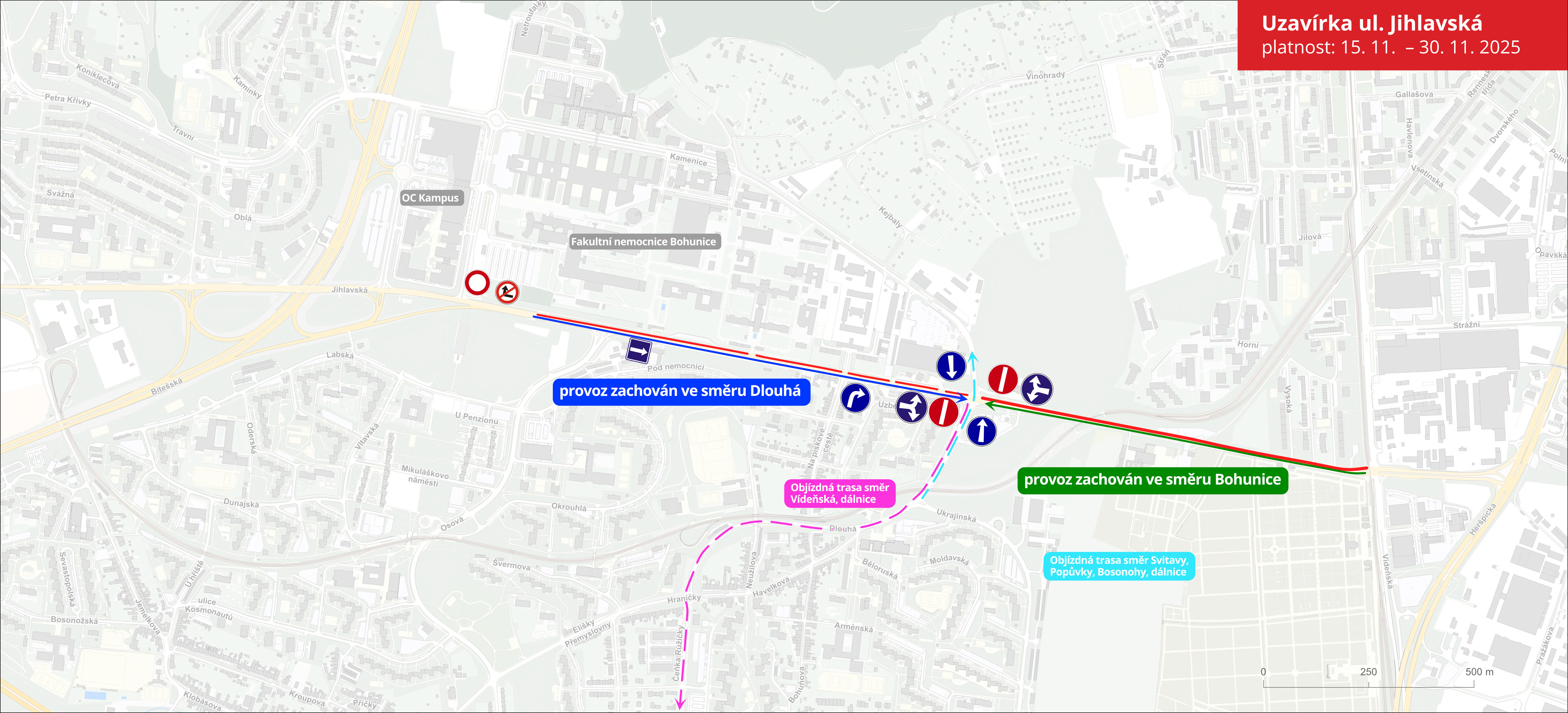 - uzavírka jednoho jízdního směru komunikace Jihlavské (úsek Vídeňská - Kamenice) ve směru z Bohunic - při zachování jednoho jízdního pruhu s jednosměrným průjezdem do Bohunic.